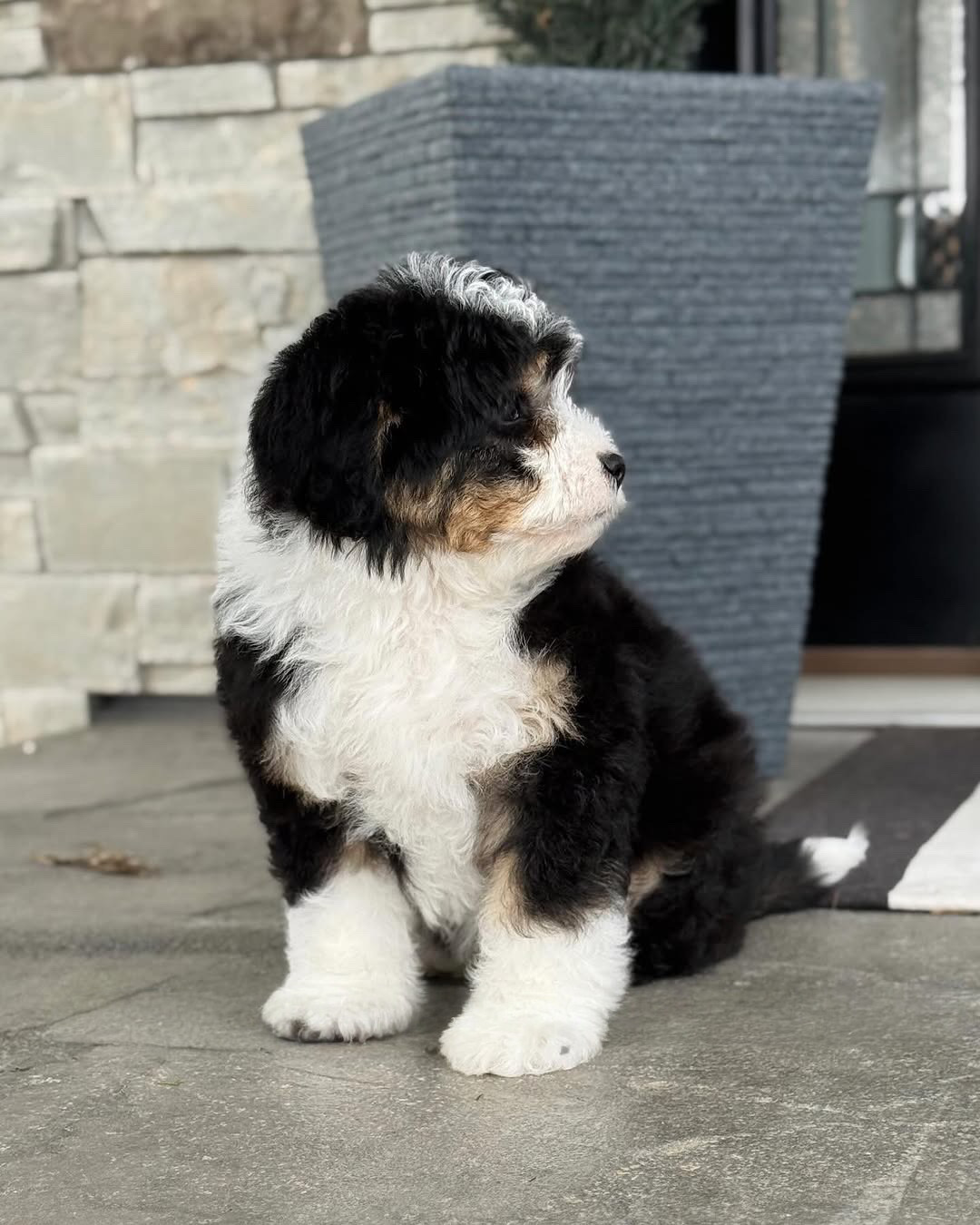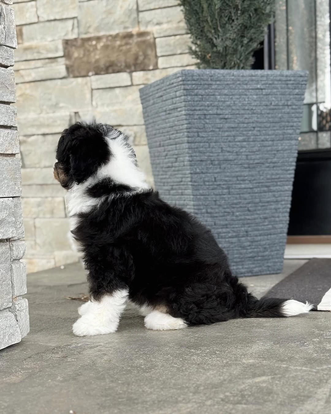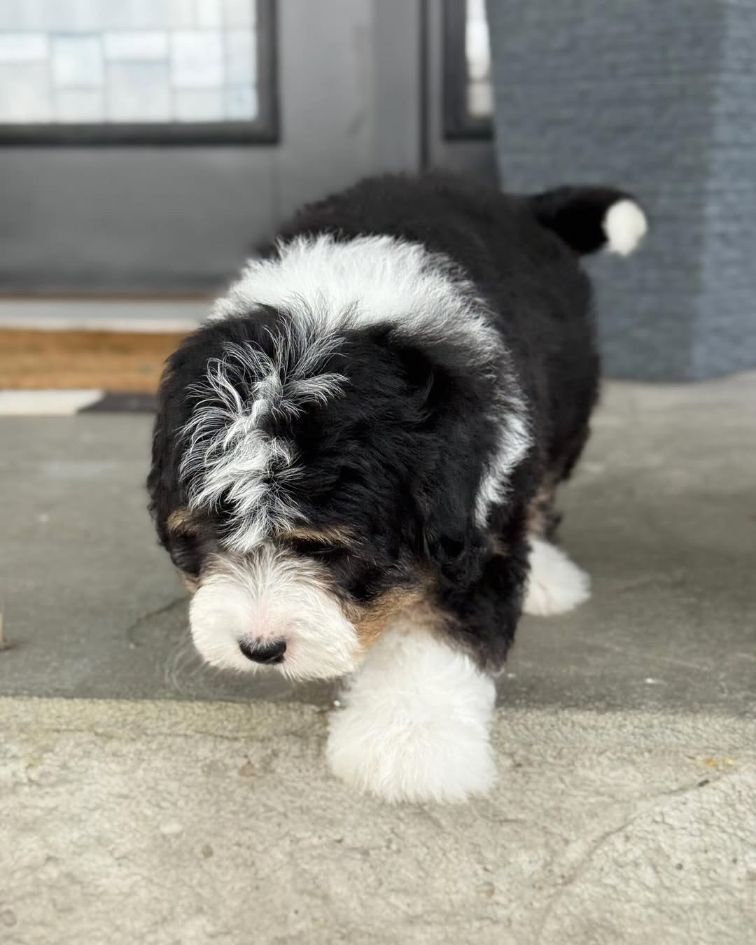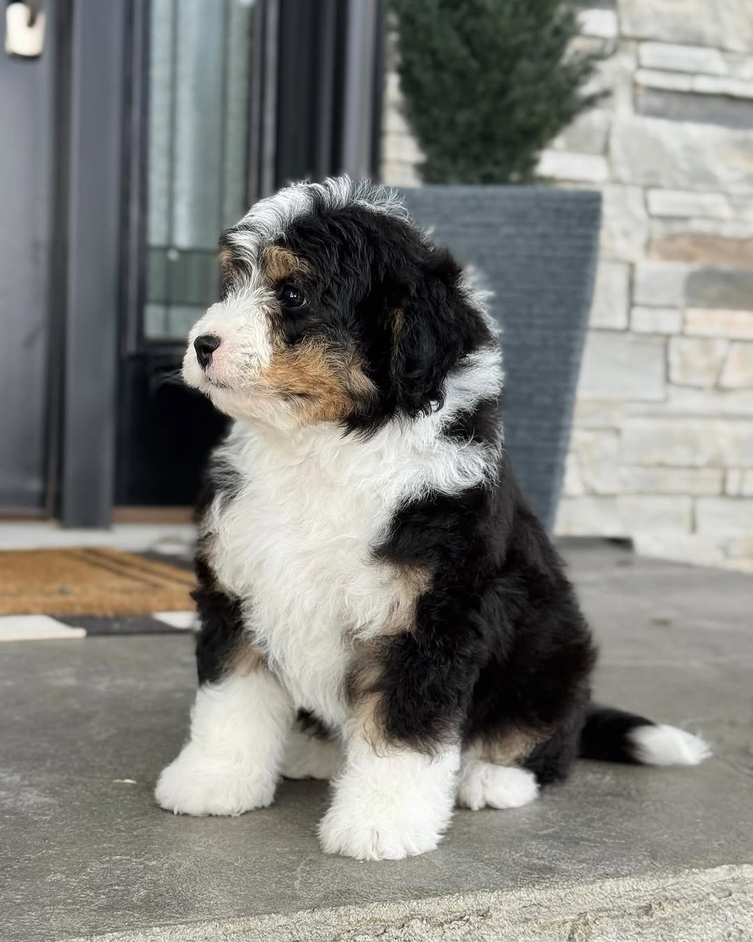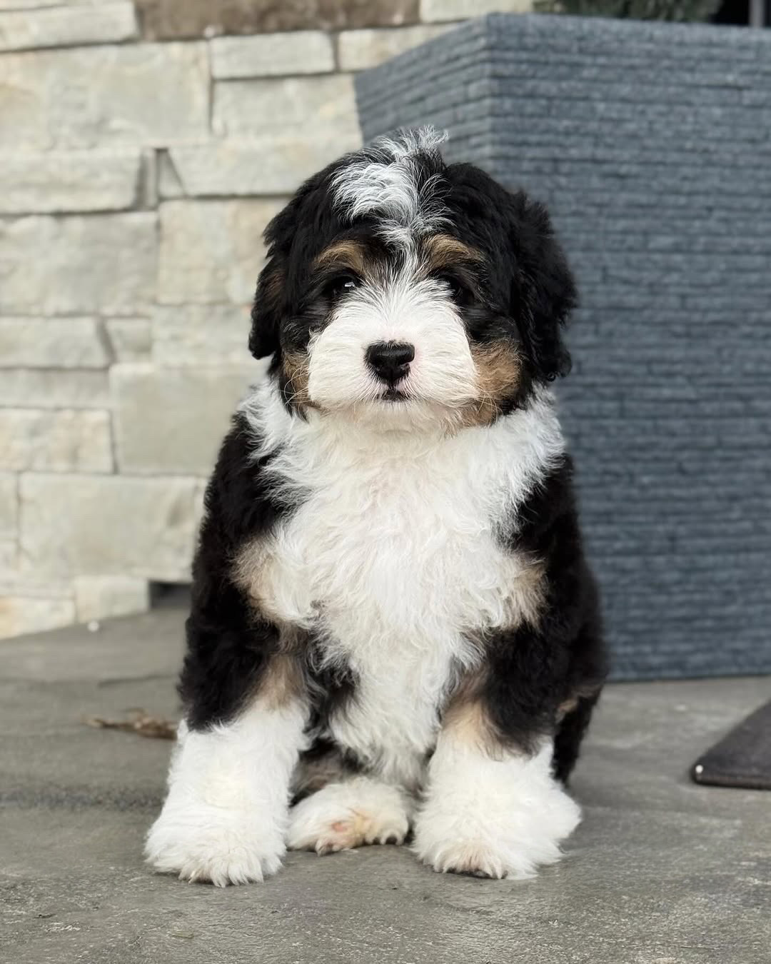 Blossom 💙 this girl is so perfect we can’t handle it 😉 she is an F1b Toy Bernedoodle with the silkiest hair coat and the most sweet and loving personality. Blossom will be approximately 15-25 lbs. full grown and will have a soft and wavy hair coat. We would LOVE for you to meet Blossom IN PERSON!